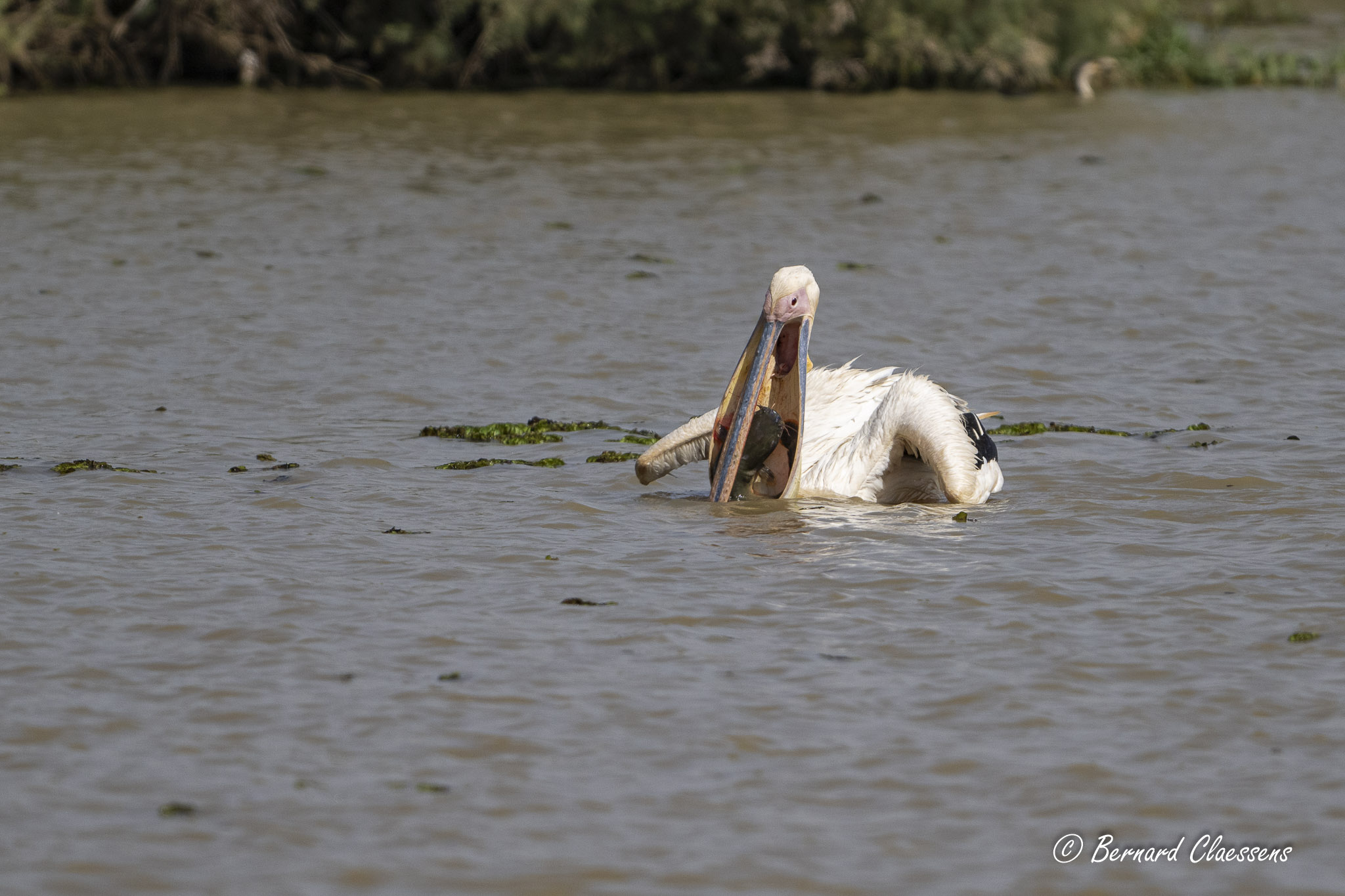 Pélican blanc : la pêche a été bonne avec ce poisson chat !